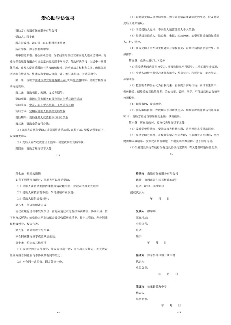 善舉創(chuàng)造和諧,愛心傳承美德。為弘揚新時代扶貧幫困的人道主義精神,南通市保安服務(wù)有限公司發(fā)動廣大黨員職工,定向資助如東縣茗海中學(xué)初三(9)班繆宇林同學(xué)。該同學(xué)母親離異,父親于今年1月因車禍搶救無效不幸生亡,奶奶肢體二級殘疾常年臥床不起,公司黨總支幫助她解決學(xué)習(xí)和生活中的困難。4月14日下午,公司黨總支副書記錢大年帶領(lǐng)相關(guān)部門負責(zé)人來到如東縣茗海中學(xué),舉行了捐資助學(xué)儀式,在副校長周軍和洋口鎮(zhèn)三江口村黨總支書記張慧劍的見證下,將公司黨員職工的愛心捐款交到了繆宇琳同學(xué)手中,希望她珍惜當(dāng)前學(xué)習(xí)條件和機會,發(fā)奮努力、刻苦學(xué)習(xí),做一個品學(xué)兼優(yōu)的好學(xué)生,公司將繼續(xù)資助其完成高中階段學(xué)業(yè)。