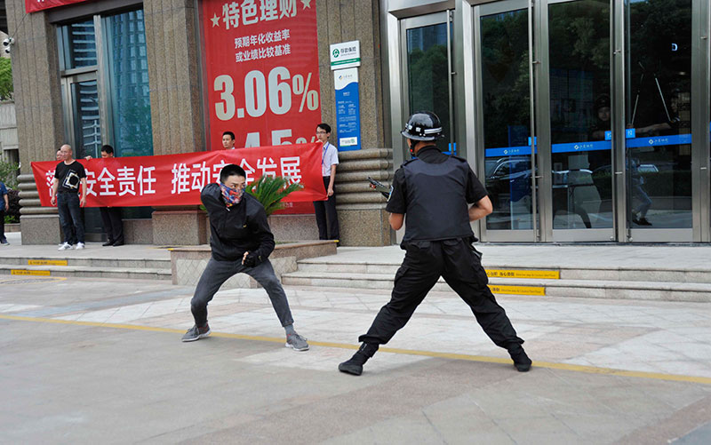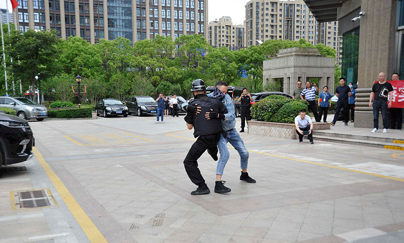 隨著演習總指揮方俊總經理一聲令下,在江蘇銀行南通分行營業(yè)廳外,經過偽裝的2名“歹徒”手持兇器實施暴力搶劫,此時危機四伏,情況緊急,只見武裝押運人員沉著冷靜、快速反應,在突發(fā)的緊急危險情況面前,充分運用伸縮警棍和鋼叉與歹徒展開搏斗,最終將歹徒一一制服,確保了押運任務的安全完成。演習過程中,押運人員和營業(yè)廳工作人員分工明確,處置情況沉著冷靜,動作操作規(guī)范,保護了人員和款箱的安全。