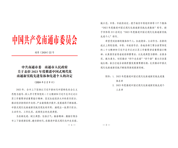 為表彰先進(jìn)、樹立典型,弘揚(yáng)正氣、振奮精神,市委、市政府向全市157個集體和215名同志授予光榮稱號。其中,南通保安公司榮獲“2023年度推進(jìn)中國式現(xiàn)代化南通新實踐先進(jìn)集體”稱號!